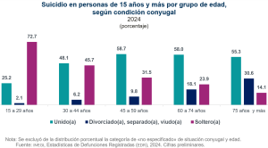 Por edad y situación conyugal de las personas fallecidas por suicidio, el porcentaje más alto se observó en la población soltera en el grupo de 15 a 29 años (72.7). En los grupos de 30 años en adelante, los porcentajes más altos correspondieron a personas unidas, mientras que, entre la población divorciada, separada o viuda, estos se registraron en el grupo de 75 años y más (30.6).