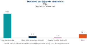 Respecto al lugar donde ocurrieron los suicidios (lugar de ocurrencia), la vivienda particular concentró la mayoría de los casos (68.9 %), seguida por la vía pública (5.2 %) y otras ubicaciones (escuela u oficina pública, área comercial o de servicios, área deportiva, etc.) (11.1 %).
