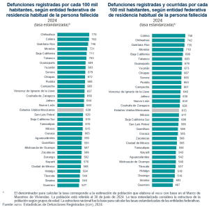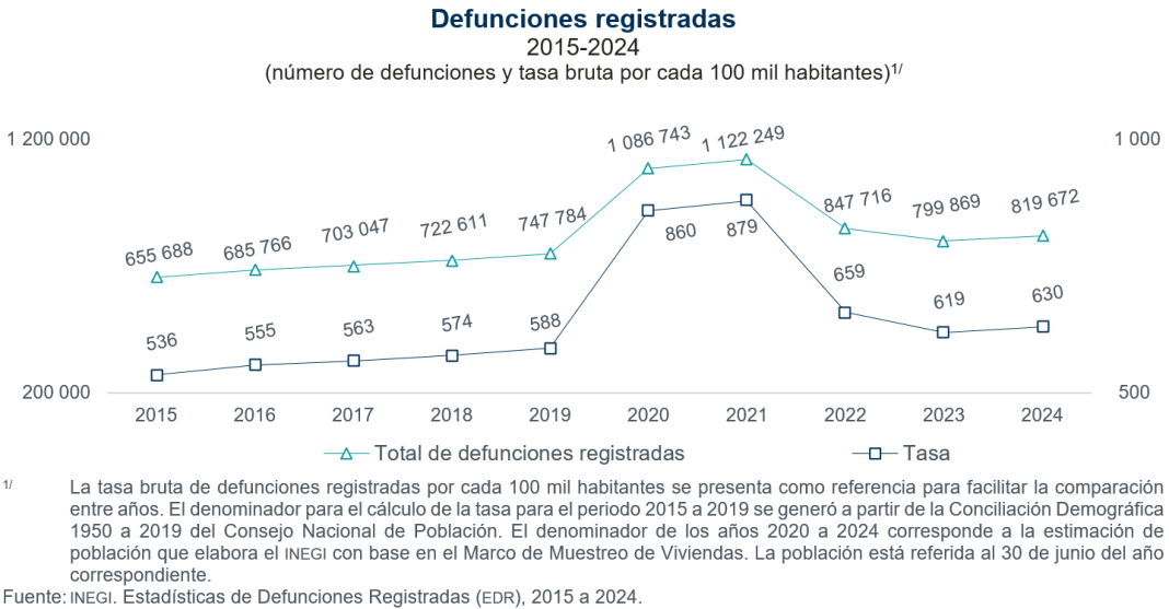 Con respecto a las defunciones registradas en 2023, se observó un incremento de 2.5 por ciento. La tasa bruta registrada por cada 100 mil habitantes fue de 630, un incremento de 11 unidades respecto a la del año anterior. Del total de defunciones registradas, 797 mil 566 ocurrieron en 2024; las restantes, en años anteriores.