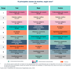 Las enfermedades del corazón, la diabetes mellitus y los tumores malignos fueron las tres primeras causas de defunción a nivel nacional, tanto para mujeres como para hombres. A partir de la cuarta posición, se observan diferencias en las 10 principales causas de defunción, entre el total y según sexo.