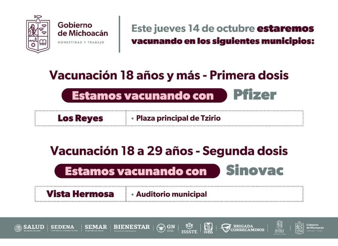 Se vacuna este jueves en dos municipios, Los Reyes y Vista Hermosa para la población de los 18 a 29 años de edad