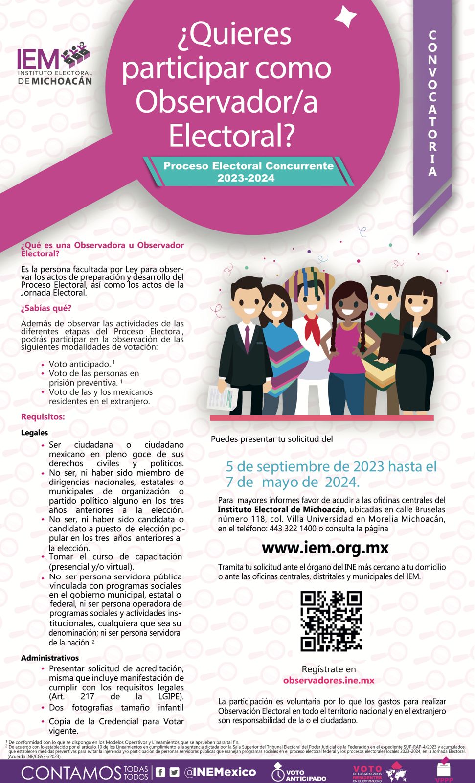 Morelia, Michoacán.- El 7 de mayo, es el último día para que las personas que deseen participar como Observadora u Observador Electoral el próximo 2 de junio puedan registrarse y dar seguimiento a las actividades de la elección de Diputaciones Locales y Ayuntamientos.