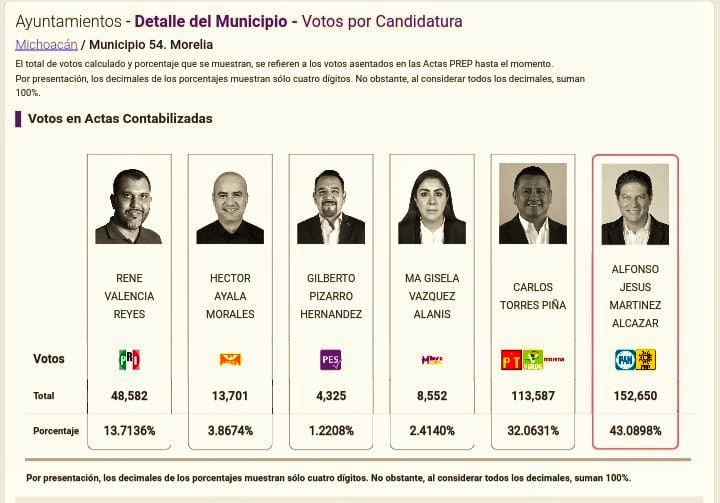 Luego de una intensa jornada electoral, donde participó el 54.44 por ciento de la población, el candidato de la coalición PAN-PRD, Alfonso Martínez encabeza la preferencia de la ciudadanía capitalina con un 43 por ciento, equivalente a 152 mil 650 votos, hasta el computo de las actas del Programa de Resultados Electorales Preliminares (PREP) en 96 por ciento.
