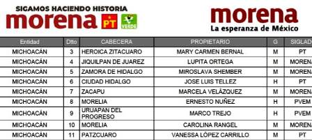 El partido Movimiento de Regeneración Nacional (MORENA), reveló la lista de sus candidatos para las diputaciones federales en Michoacán, en la apuesta, se encuentran varios perfiles que pretenden repetir plato.
