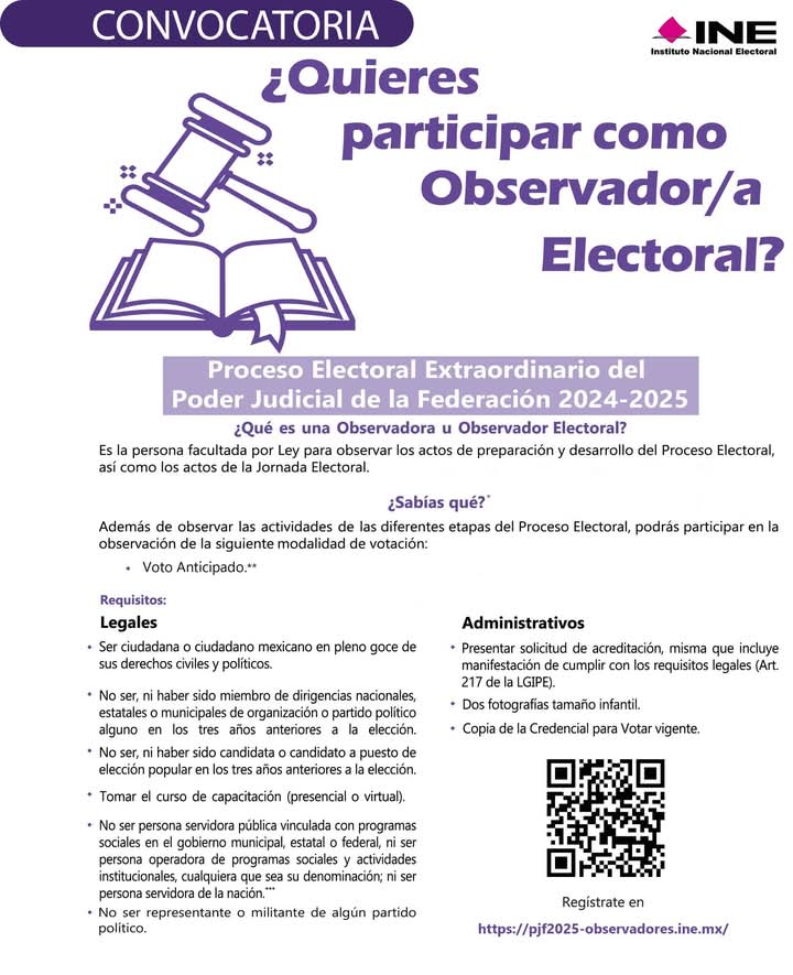 De igual manera, para poder ser observadores electoral, deberán ser ciudadanos mexicanos, no ser, ni haber sido.miembro de dirigencias nacionales, estatales o municipales de organizaciones o partidos políticos en los tres años previos a la elección; no haber sido o ser candidato a un puesto de elección en los últimos tres años; tomar el curso de capacitación presencial o virtual; y no ser servidor público o vinculado con programas sociales en los diferentes niveles de gobierno; así como, no ser personal operador de programas sociales o instituciones sociales, ni tampoco ser servidor de la nación, ni ser representante o militante de algún partido político.