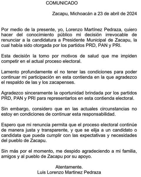 El candidato a la alcaldía de Zacapu por la alianza tripartita entre el PRD, PRI y PAN, Luis Lorenzo Martínez Pedraza, ha decidido abandonar la contienda electoral debido a las condiciones de inseguridad que enfrenta.