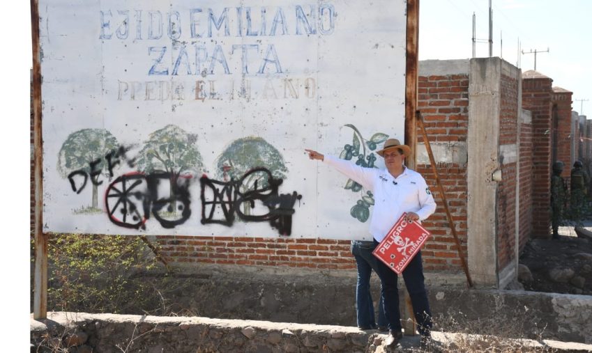 Coloca líder estatal del PRI letreros donde advierte a la población el riesgo de transitar en zonas minadas, en Buena Vista
