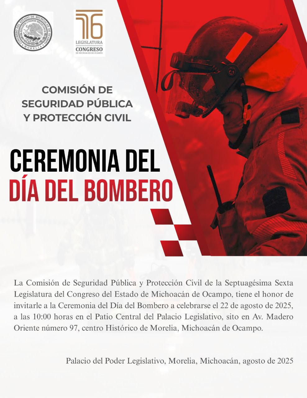 Con motivo del Día del Bombero, a celebrarse el próximo 22 de agosto, la Comisión de Seguridad Pública y Protección Civil, que preside el diputado Vicente Gómez Núñez, invita a la ceremonia conmemorativa que se realizará en el Patio Central del Palacio Legislativo.
