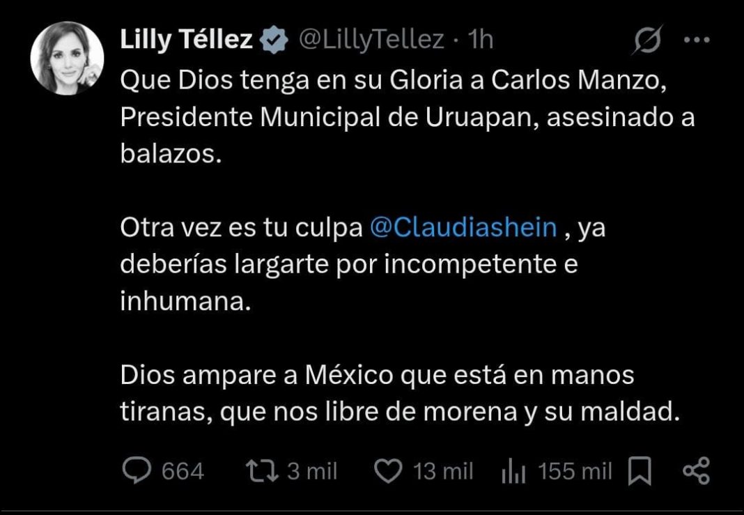 «Que Dios tenga en su Gloria a Carlos Manzo, Presidente Municipal de Uruapan, asesinado a balazos», lamenta primero el crimen.