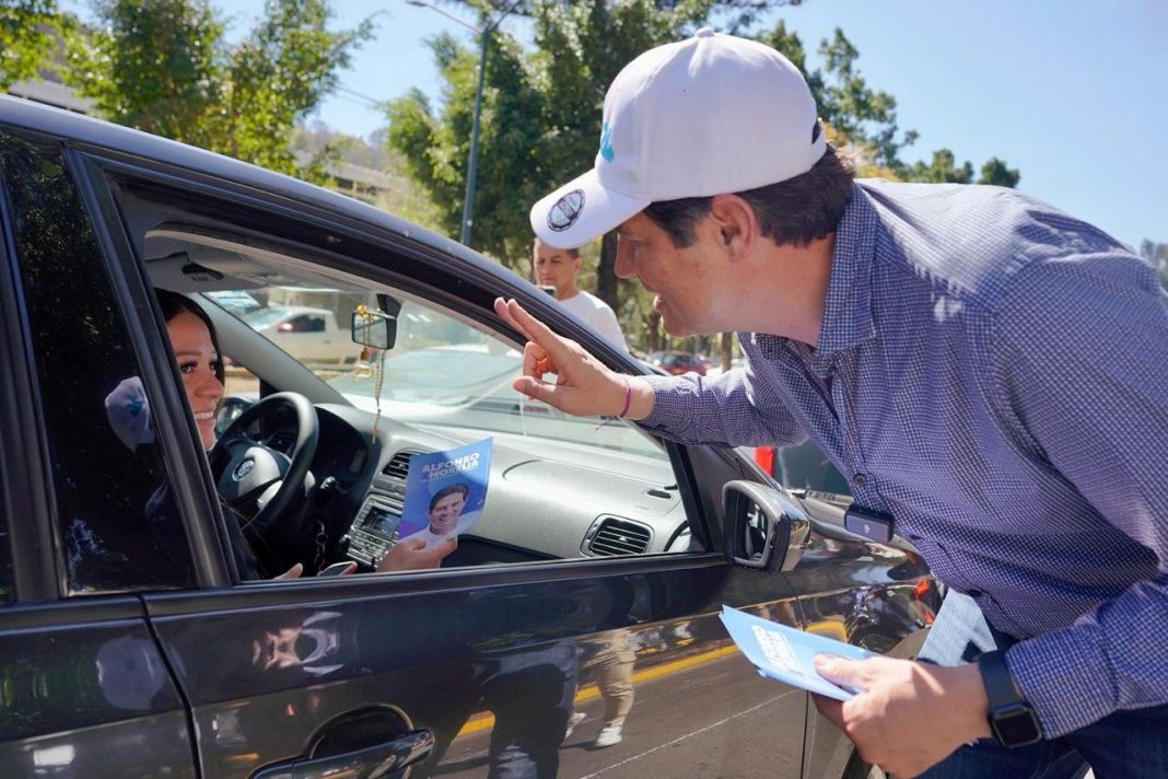 Alfonso Martínez Alcázar se dio un tiempo este mediodía para acercarse a los morelianos automovilistas, saludarles de mano y entregarles un volante con su fotografía, en refrendo de su aspiración a reelegirse como alcalde de Morelia este 2024. Pegó también de calcomanías con su nombre y de color azul, acompañado por brigadistas de Acción Nacional, partido al cual perteneció hace años pero que le ha venido respaldando.