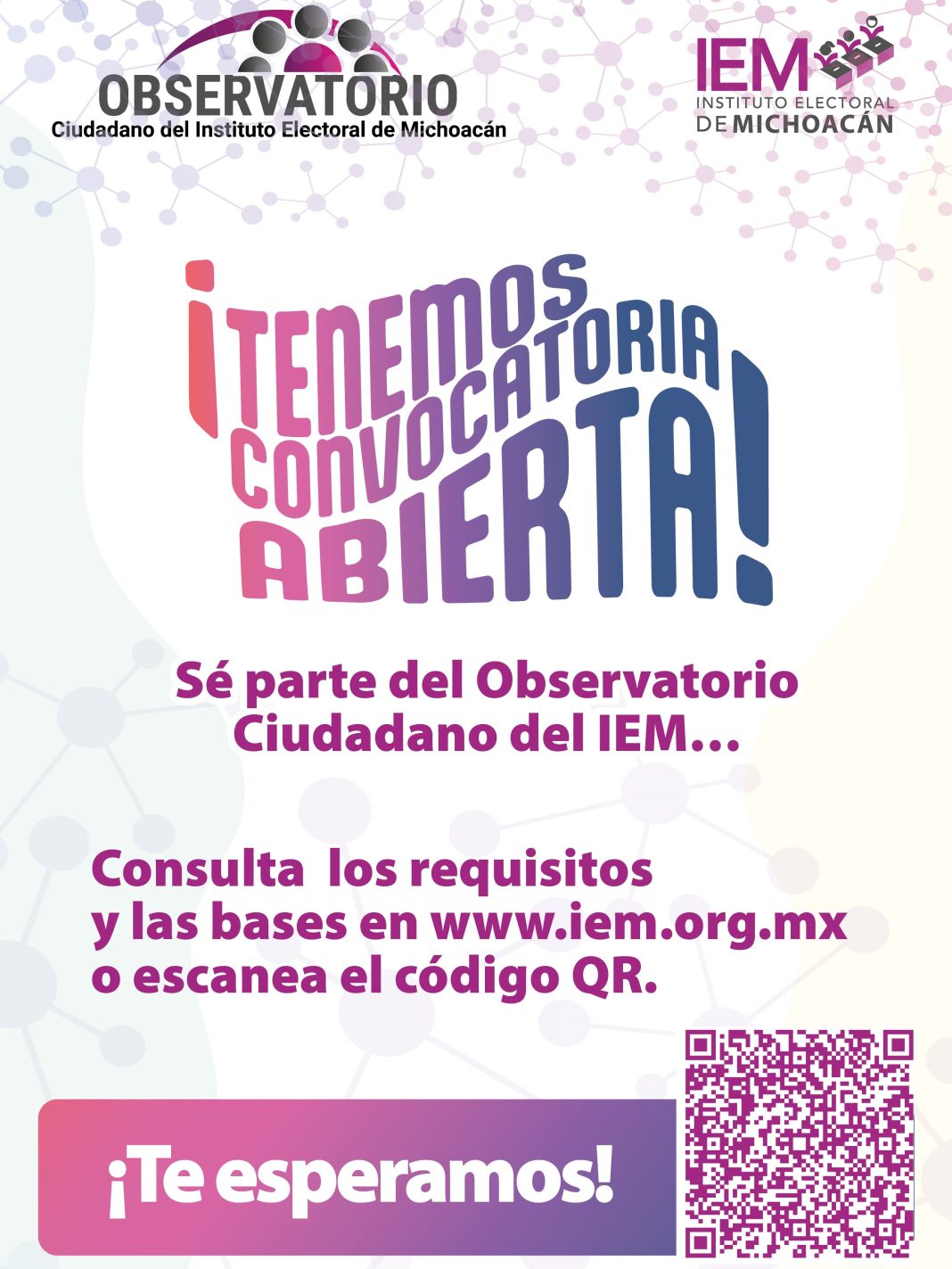 El Instituto Electoral de Michoacán (IEM) invita a la ciudadanía interesada en participar en la vida pública del estado y fortalecer la democracia a formar parte de su Observatorio Ciudadano. La convocatoria estará abierta hasta el 31 de enero de 2025.