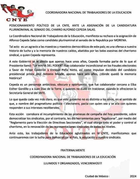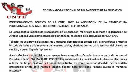 La dirigencia en el país de la Coordinadora Nacional de Trabajadores de la Educación, que integra a todas las alas oficiales del magisterio michoacano de los estados, ha rechazado y denostado la designación de Alfonso Cepeda Salas como candidato plurinominal al senado de la República por Morena. Tal acto del dirigente del Sindicato Nacional de Trabajadores de la Educación que es el sindicato madre del cual es brazo ramificado la Coordinadora, «es un agravio a las maestras y maestros», ha dicho la CNTE del ala oficial a nivel nacional  mediante un desplegado en que condena el proceder del sentista.