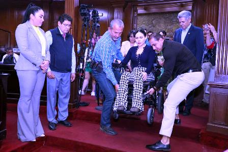 El evento tuvo lugar en el congreso del Estado, donde Rosales Reyes llegó en silla de ruedas, recordatorio de un atentado que sufrió en 2021, el cual la dejó con serias dificultades de movilidad.
