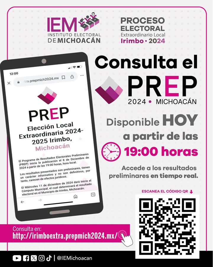 Morelia, Michoacán.- A partir de las 19:00 horas de este domingo, Irimbo, Michoacán, comenzará la publicación de los Resultados Electorales Preliminares (PREP), según informó el Instituto Electoral de Michoacán (IEM).