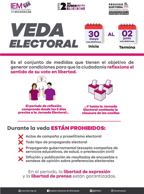 La veda inicia a partir de los tres días previos a la jornada electoral, es decir, inicia el 30 de mayo, este lapso está destinado a permitir que los electores reflexionen y decidan, si es que no lo han hecho, a qué candidatos darán su voto el próximo 2 de junio.