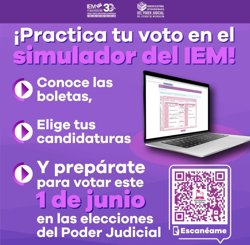 Con el objetivo de que la ciudadanía llegue bien informada a las urnas el próximo 1 de junio, el Instituto Electoral de Michoacán (IEM) invita a utilizar el simulador digital “Practica tu voto”, una herramienta que te permite conocer de manera anticipada cómo serán las boletas y cómo marcar tu voto correctamente en la elección judicial extraordinaria que se llevará a cabo en Michoacán.