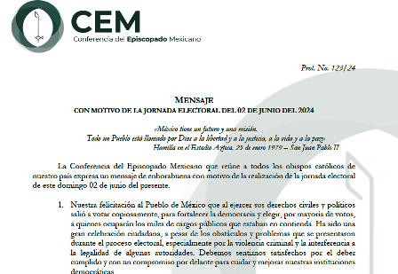 Con esta jornada electoral, el pueblo mexicano ha dado un testimonio admirable de participación y madurez democrática, y externa la CEM: «como pastores, nos llena de esperanza ver cómo los ciudadanos abrazan los valores del bien común. Que este espíritu nos siga animando e inspirando en la construcción de un futuro más brillante para nuestra querida patria».