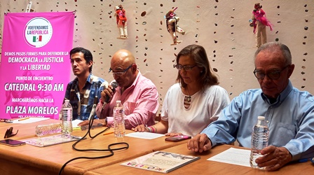 Integrantes de la Marea Rosa Morelia piden a AMLO que saque las manos del proceso electoral.