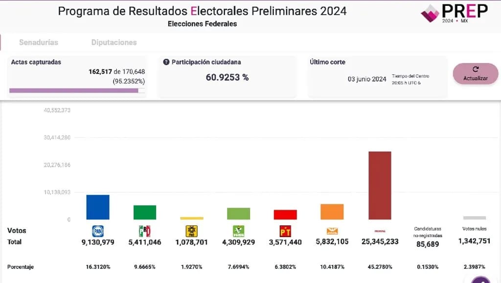 Los resultados arrojan que el porcentaje del aurinegro fue de 1.92 por ciento, muy por debajo del 3 por ciento requerido para seguir siendo un partido con registro nacional. Es decir, las cifras de sufragios de ese instituto político arrojadas por el PREP sumaron un millón 078 mil 070. De éstos, 7 mil 148 fueron votos provenientes de mexicanos en el extranjero y el resto en el país este 2 de Julio.