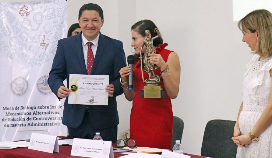 El ex presidente del Tribunal en materia Anticorrupción y Administrativa del estado (TAAM), antes Tribunal de Justicia Administrativa de Michoacán, recibió el reconocimiento de manos de la presidenta de la Asociación, la doctora Fanny Lorena Jiménez Aguirre, en el marco de la inauguración de un Centro de Justicia Alternativa del propio TAAM.