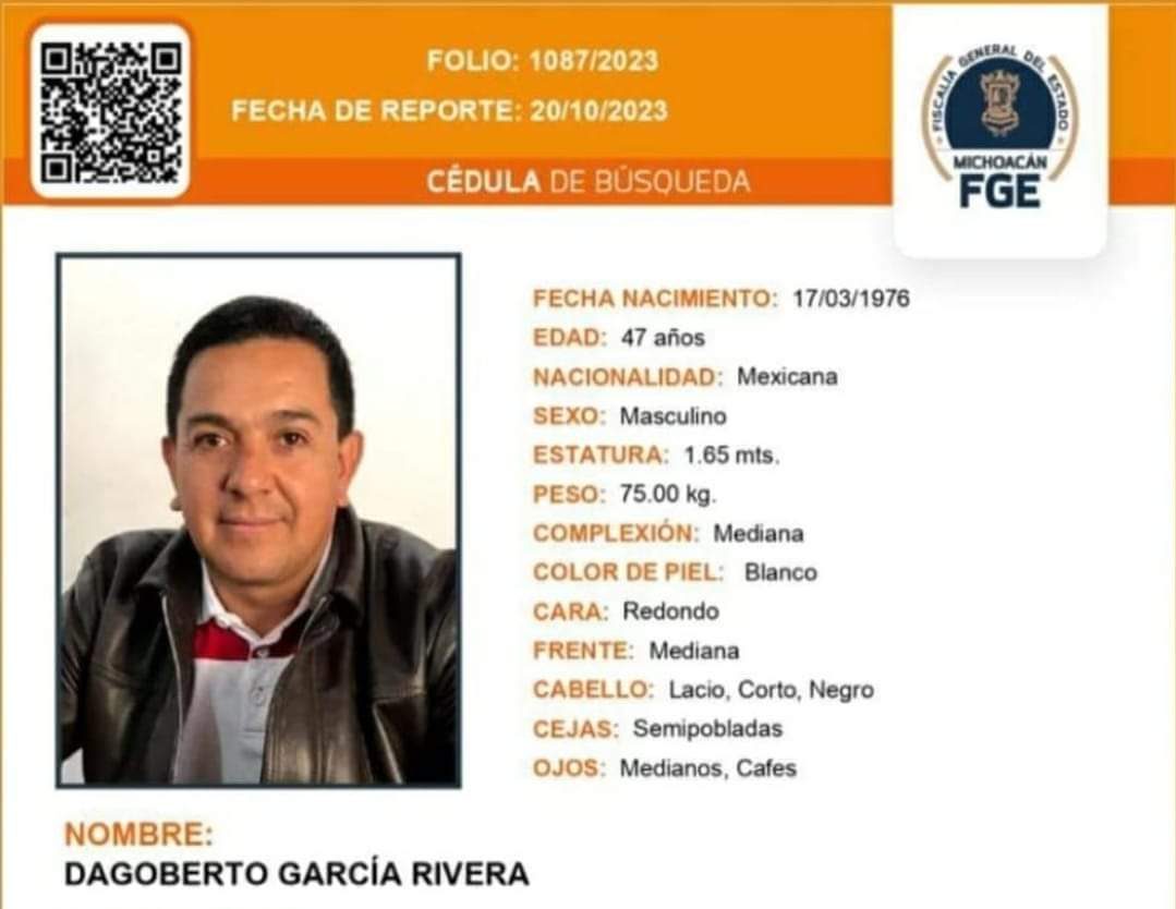 Dagoberto García fue reportado como desaparecido desde el pasado 19 de octubre en Maravatío. En su momento, el gobernador Alfredo Ramírez Bedolla confirmó el hecho sin dar más detalles de lo que había ocurrido.