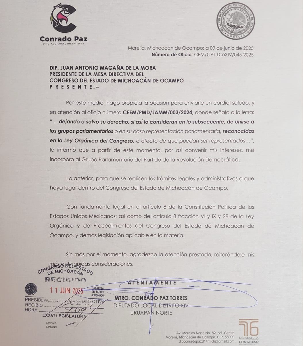 En una jugada estratégica y a contrarreloj, el diputado Conrado Paz Torres, originario del distrito 14 de Uruapan Norte, quien hace unas semanas abandonó su pertenencia al grupo de La Sombreriza, ahora formalizó su integración al grupo parlamentario del Partido de la Revolución Democrática Michoacán (PRDM) para impedir la desaparición de su bancada en la 76 Legislatura del Congreso local.