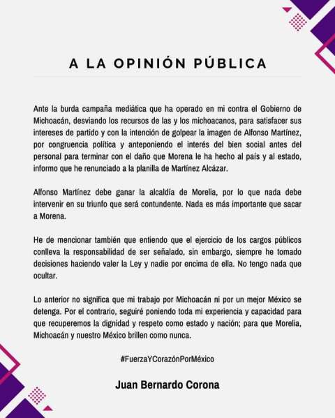 En un giro inesperado en la política local de Morelia, Juan Bernardo Corona Martínez anunció su decisión de no participar en la planilla de Alfonso Martínez Alcázar, quien busca su tercera reelección como presidente municipal de Morelia.
