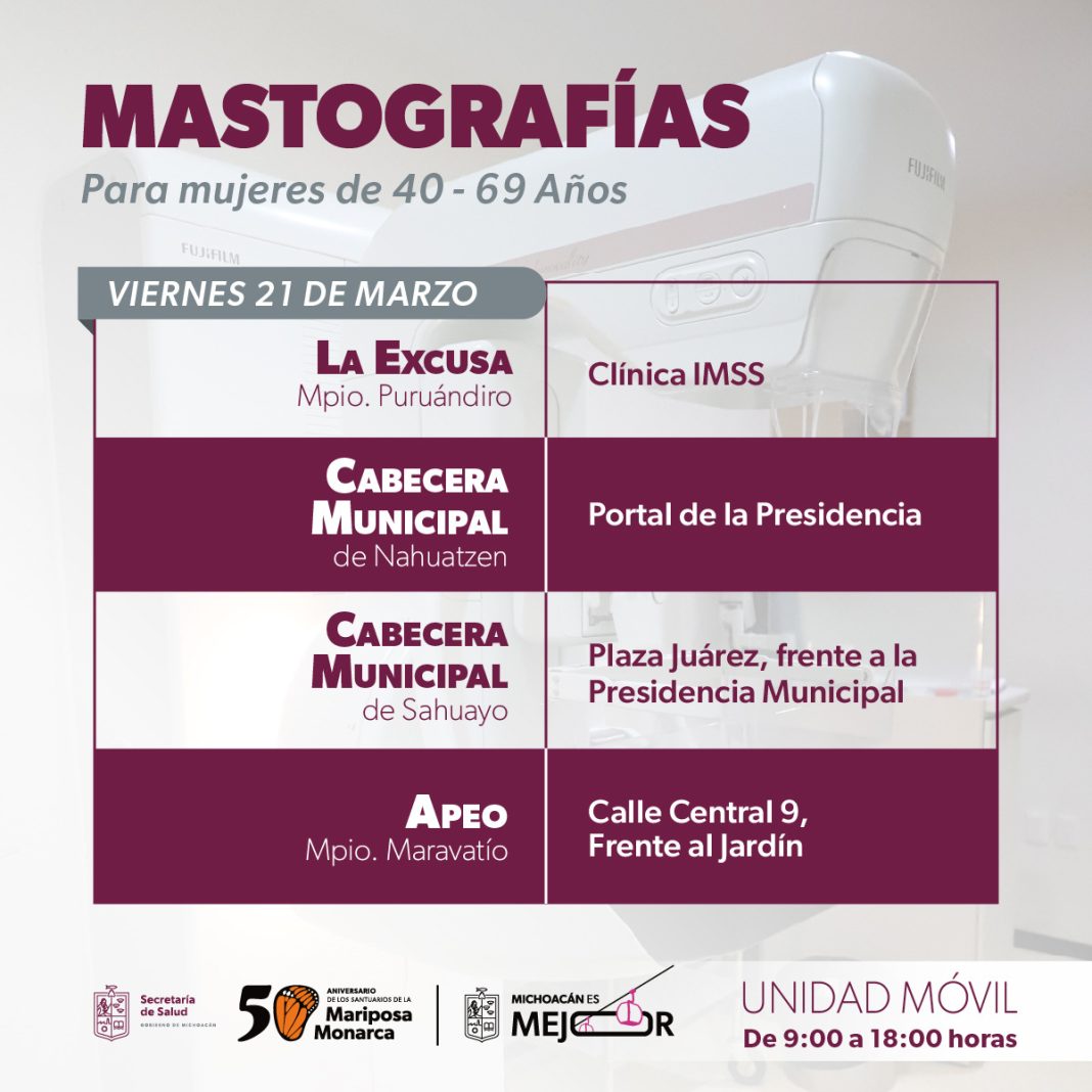 Morelia, Michoacán.- La Secretaría de Salud de Michoacán (SSM) invita a mujeres de 40 a 69 años de los municipios de Puruándiro, Cherán, Sahuayo, Queréndaro, Maravatío y Nahuatzen a ubicar la unidad móvil de mastografía más cercana a su comunidad, para que se realicen este estudio gratuito que ayuda a detectar el cáncer de mama.
