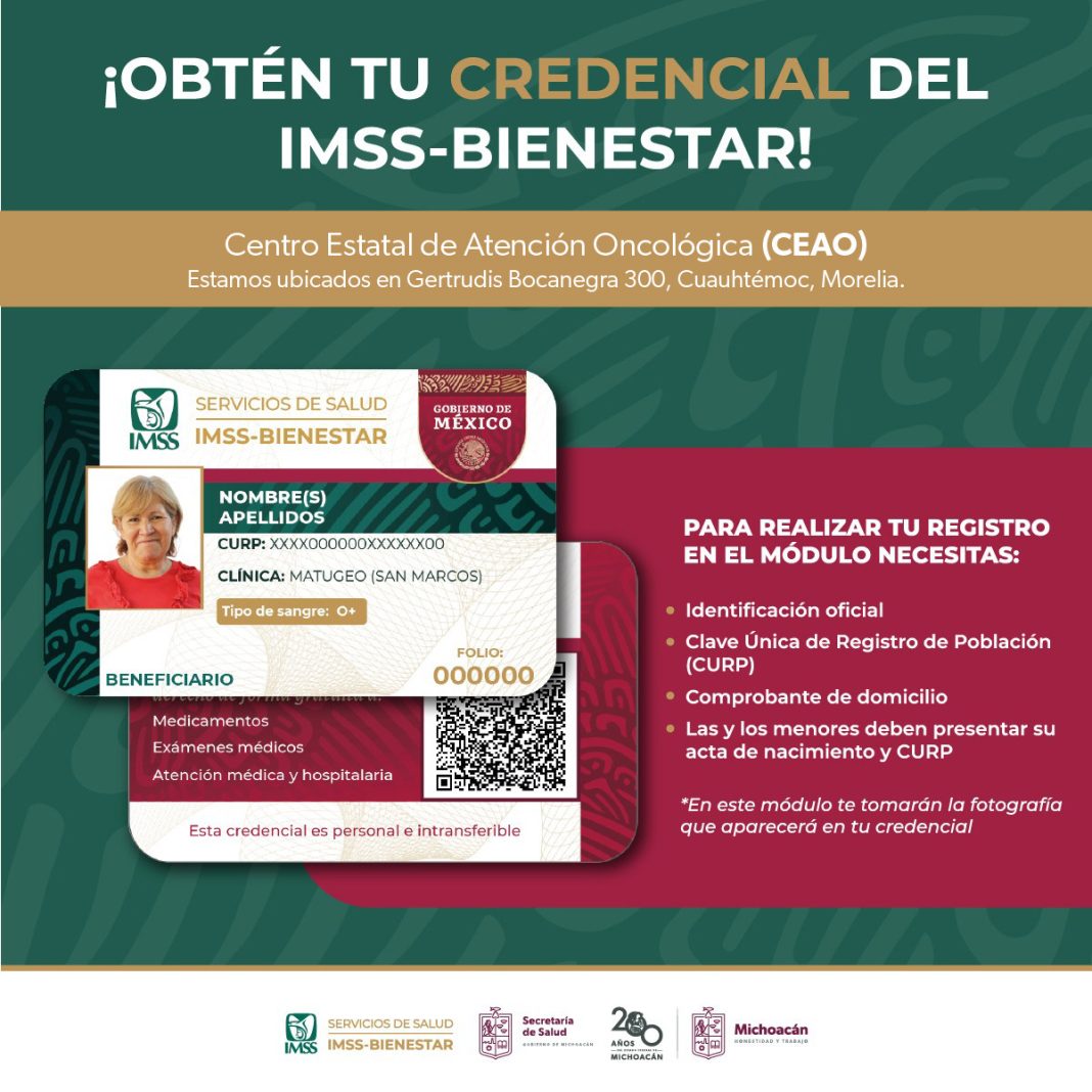 El Centro Estatal de Atención Oncológica (CEAO), abre su módulo de afiliación al IMSS Bienestar, en el que de lunes a domingo y días festivos, la población sin seguridad social puede solicitar su credencial para obtener consultas, medicinas y estudios de laboratorio sin costo, en los 364 centros de salud y 27 hospitales que hay en Michoacán.