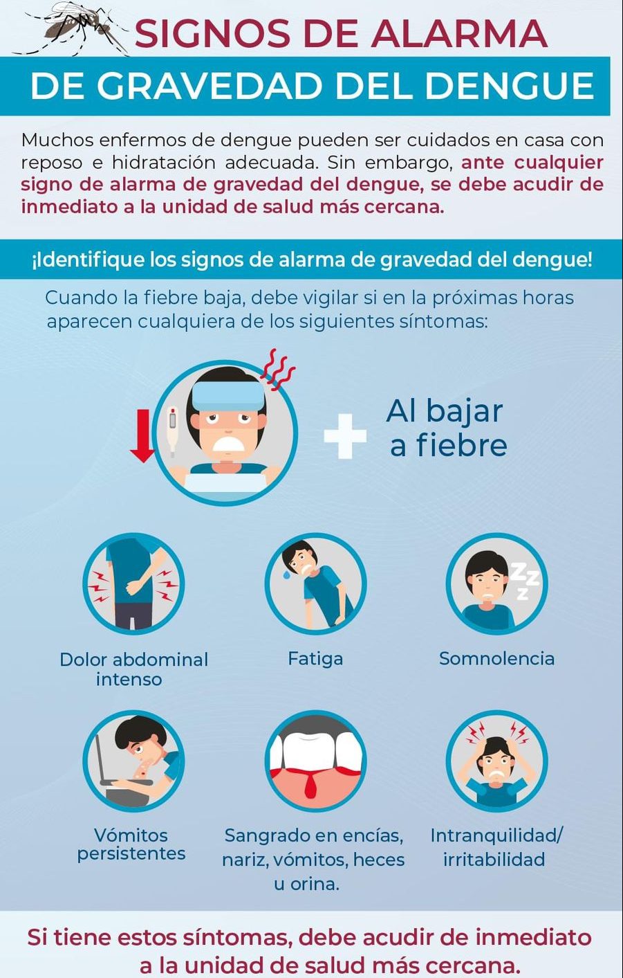 En los casos más graves puede haber hemorragia profusa por nariz o encías, vómito con sangre o sangre en las heces (al menos tres veces en 24 horas), sensación de cansancio, inquietud o irritabilidad, dolor o sensibilidad en el estómago, y un shock, que pueden llevar a la muerte, por ello, la importancia de no automedicarse.