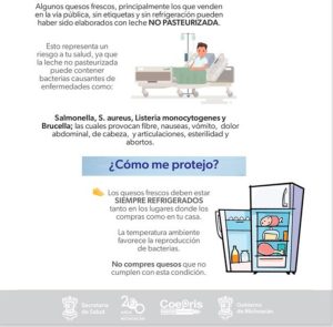 La Secretaría de Salud de Michoacán (SSM), a través de la Comisión Estatal para la Protección contra Riesgos Sanitarios (Coepris) recomienda a la población a consumir productos elaborados con leche pasteurizada, para prevenir enfermedades como brucelosis, salmonelosis y listeriosis