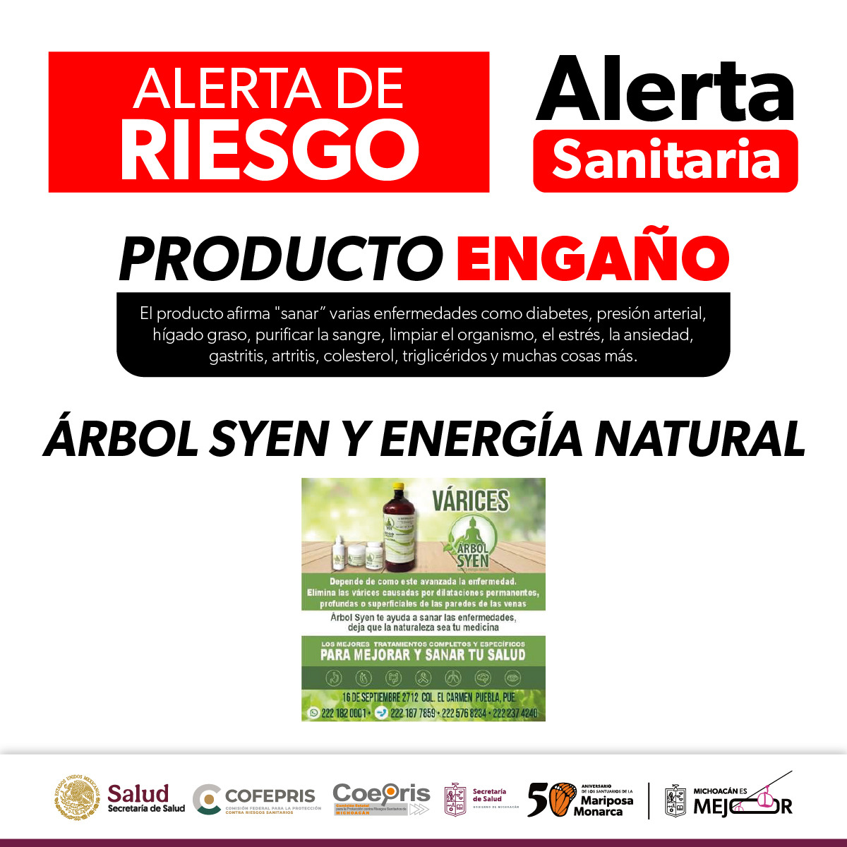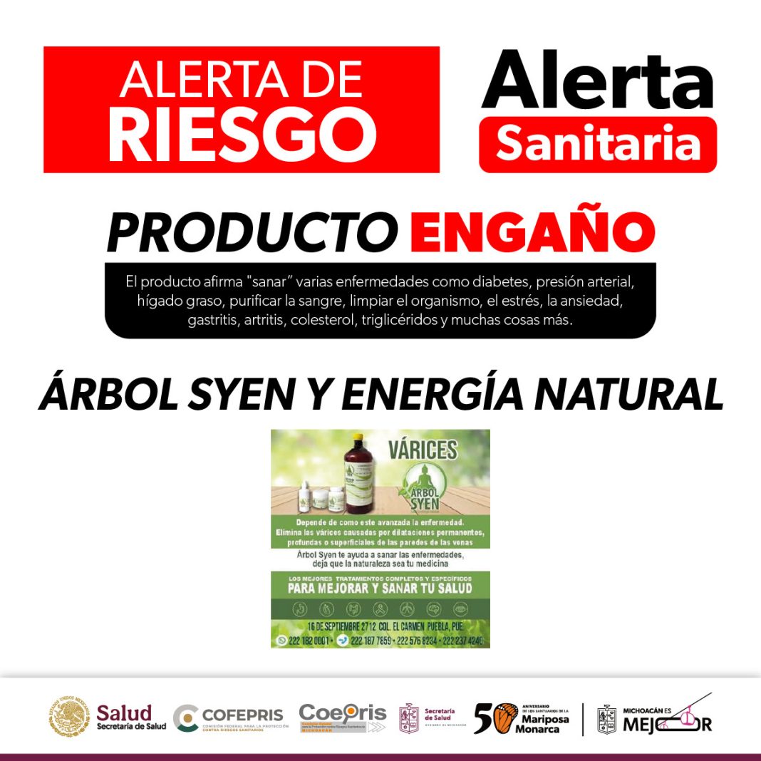 Morelia, Michoacán.- La Comisión Federal para la Protección contra Riesgos Sanitarios (Cofepris) a través de la Secretaría de Salud de Michoacán (SSM), informa a la población sobre una alerta sanitaria emitida en relación con el producto denominado “Árbol Syen y energía natural”, el cual se comercializa principalmente a través de redes sociales.