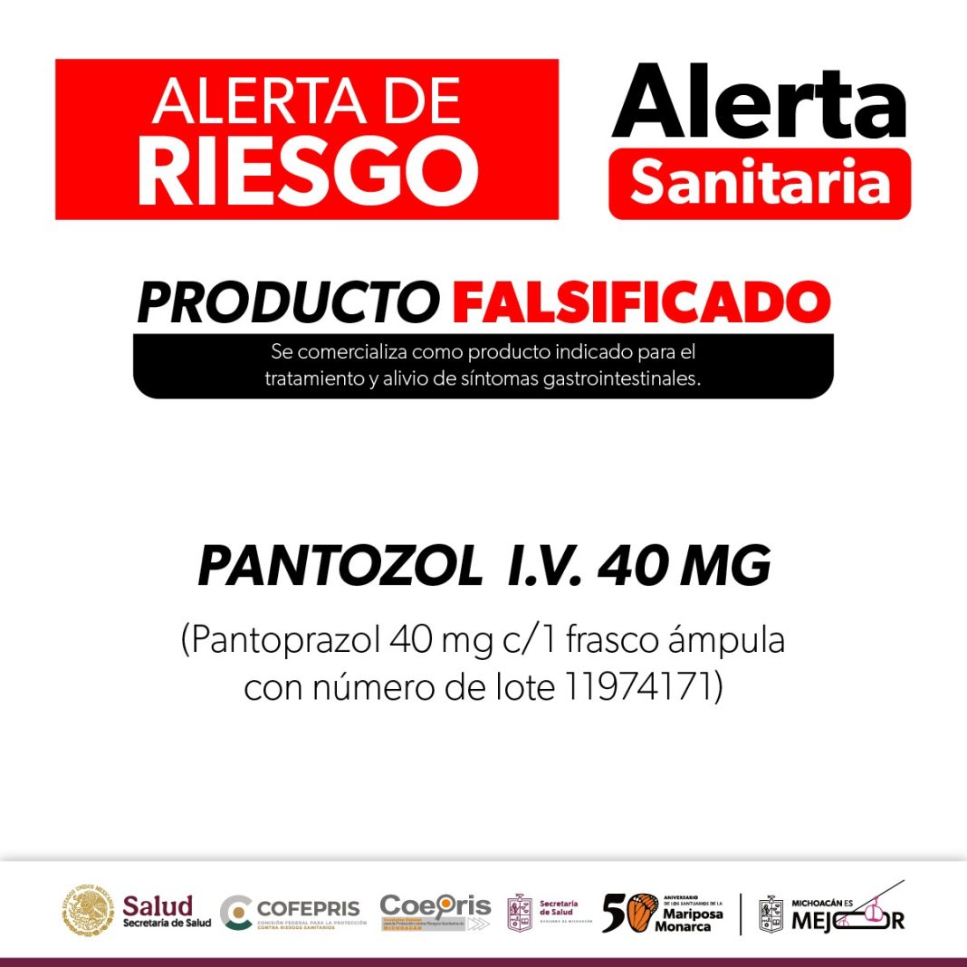 La Comisión Federal para la Protección contra Riesgos Sanitarios (COFEPRIS) a través de la Secretaría de Salud de Michoacán (SSM), informa a la población sobre la falsificación del medicamento PANTOZOL® I.V. (Pantoprazol) 40 mg c/1 frasco ámpula, con el número de lote 11974171.