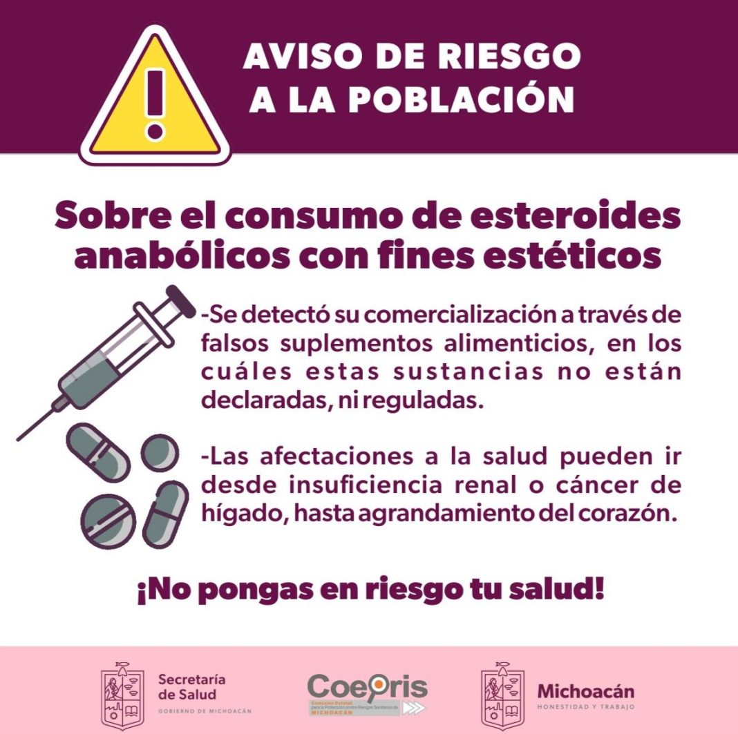 La Secretaría de Salud de Michoacán (SSM), a través de la Comisión Estatal para la Protección contra Riesgos Sanitarios (Coepris), alerta a la población sobre el consumo de esteroides anabólicos con fines estéticos, lo que representa un riesgo para la salud.