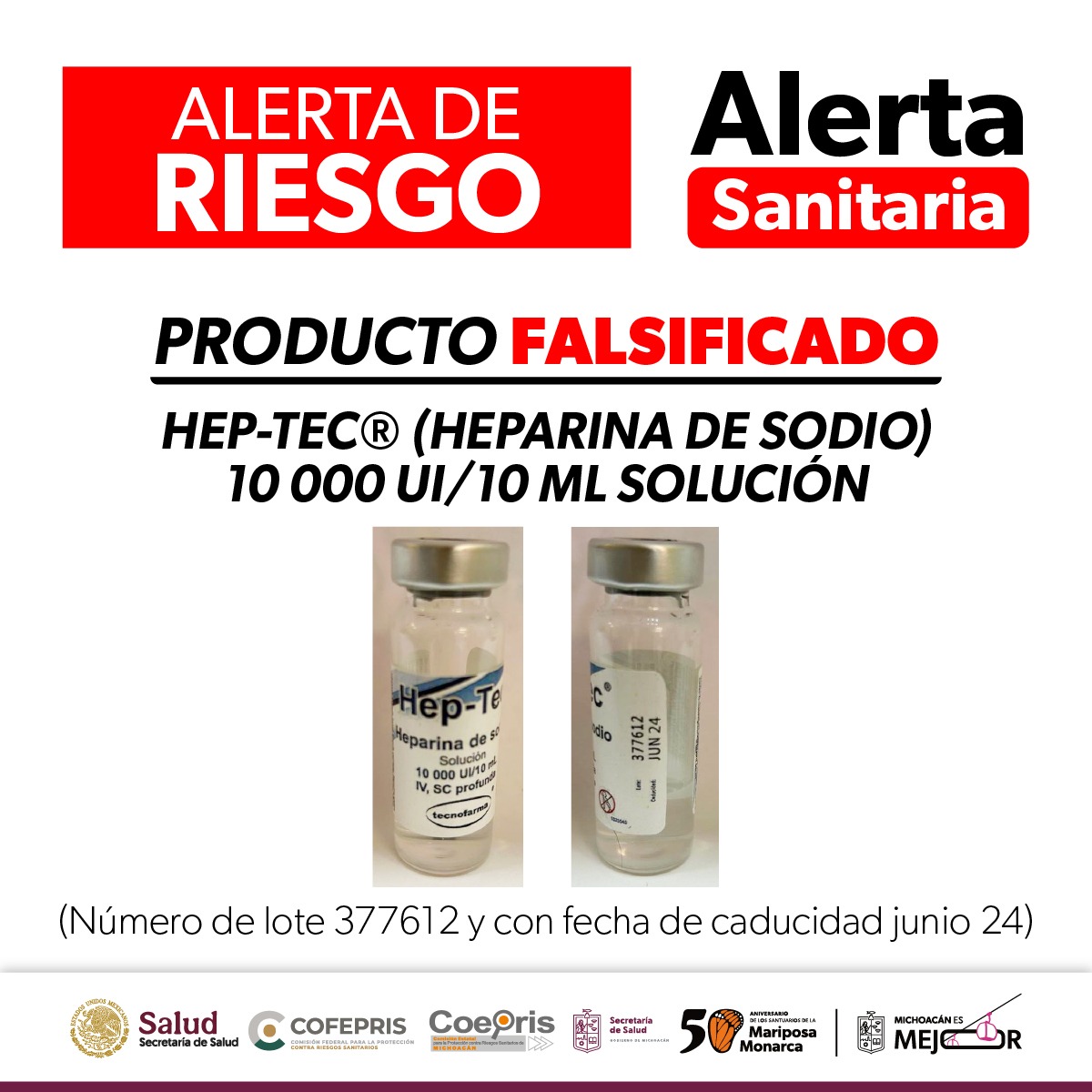 La Comisión Federal para la Protección contra Riesgos Sanitarios (Cofepris), a través de la Secretaría de Salud de Michoacán (SSM), informa a la población sobre la identificación de producto falsificado Hep-Tec (heparina de sodio) 10 000 UI/10 ml solución.
