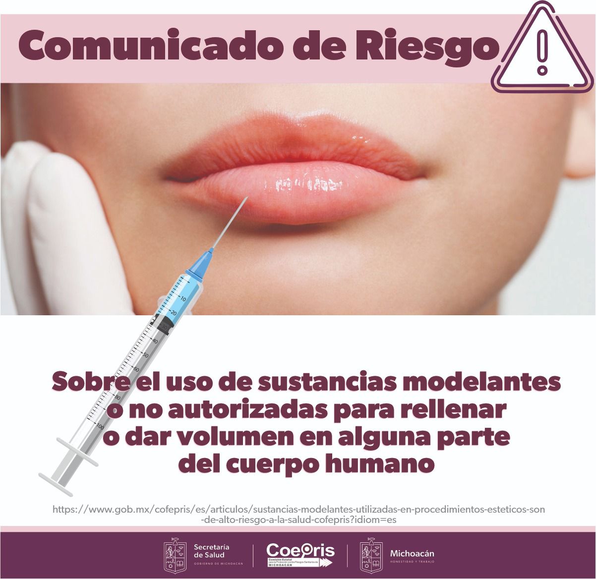 La Comisión Federal para la Protección contra Riesgos Sanitarios (Cofepris), a través de la Secretaría de Salud de Michoacán (SSM), alerta a la población sobre los riesgos a la salud por la aplicación de sustancias modelantes no absorbibles o no biodegradables empleadas durante cirugías plásticas, estéticas y/o reconstructivas, en las que se busca modificar la apariencia corporal.