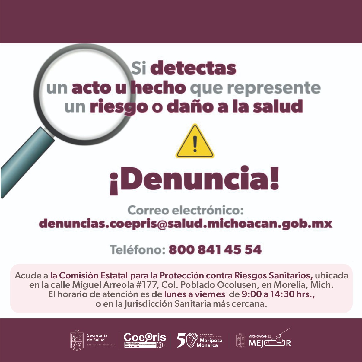 La Secretaría de Salud de Michoacán (SSM), a través de la Comisión Estatal para la Protección contra Riesgos Sanitarios de Michoacán (Coepris), invita a la población a reportar cualquier hecho, actividad o producto que represente un riesgo a la salud pública.