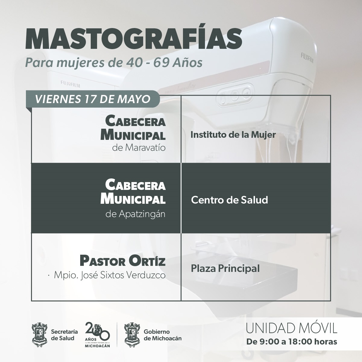 El lunes 13 de mayo, las unidades móviles de mastografía, que cuentan con capacidad para atender hasta 120 usuarias por día, estarán en el centro de salud de Apatzingán y en las plazas principales de Puruándiro y San Miguel Curahuango, tenencia de Maravatío.
