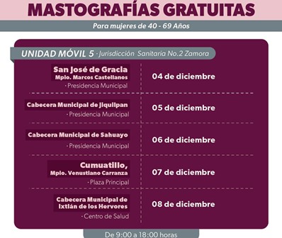Del 4 al 8 de diciembre, la Secretaría de Salud de Michoacán (SSM) realizará jornadas de mastografías gratuitas en plazas públicas, centros de salud y presidencias de los municipios de La Piedad, Tanhuato, Marcos Castellanos, Jiquilpan, Ixtlán, Sahuayo y Venustiano Carranza.