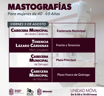El miércoles 7 y jueves 8, las mujeres podrán solicitar su mastografía en las plazas principales de Pátzcuaro, Jiquilpan, Lázaro Cárdenas y Jungapeo. El viernes 9 de agosto los mastógrafos móviles estarán en las plazas principales de Lázaro Cárdenas, Sahuayo, Pátzcuaro y en la comunidad de Lázaro Cárdenas, perteneciente a Jungapeo.