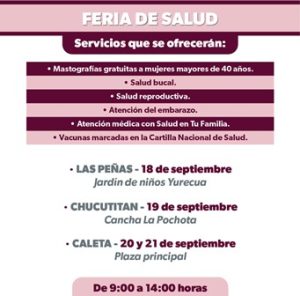 En Chucutitan, la atención a los pacientes se llevará a cabo el martes 19 de septiembre en la cancha de fútbol La Pochota, de 09:00 a 14:00 horas; mientras que, en Caleta de Campos, la Feria de Salud se realizará los días 20 y 21 de septiembre en la plaza principal.