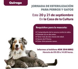La Secretaría de Salud de Michoacán (SSM) y el Ayuntamiento de Quiroga realizarán una jornada de esterilización canina y felina los días 20 y 21 de septiembre, en las instalaciones de la Casa de la Cultura de dicho municipio.