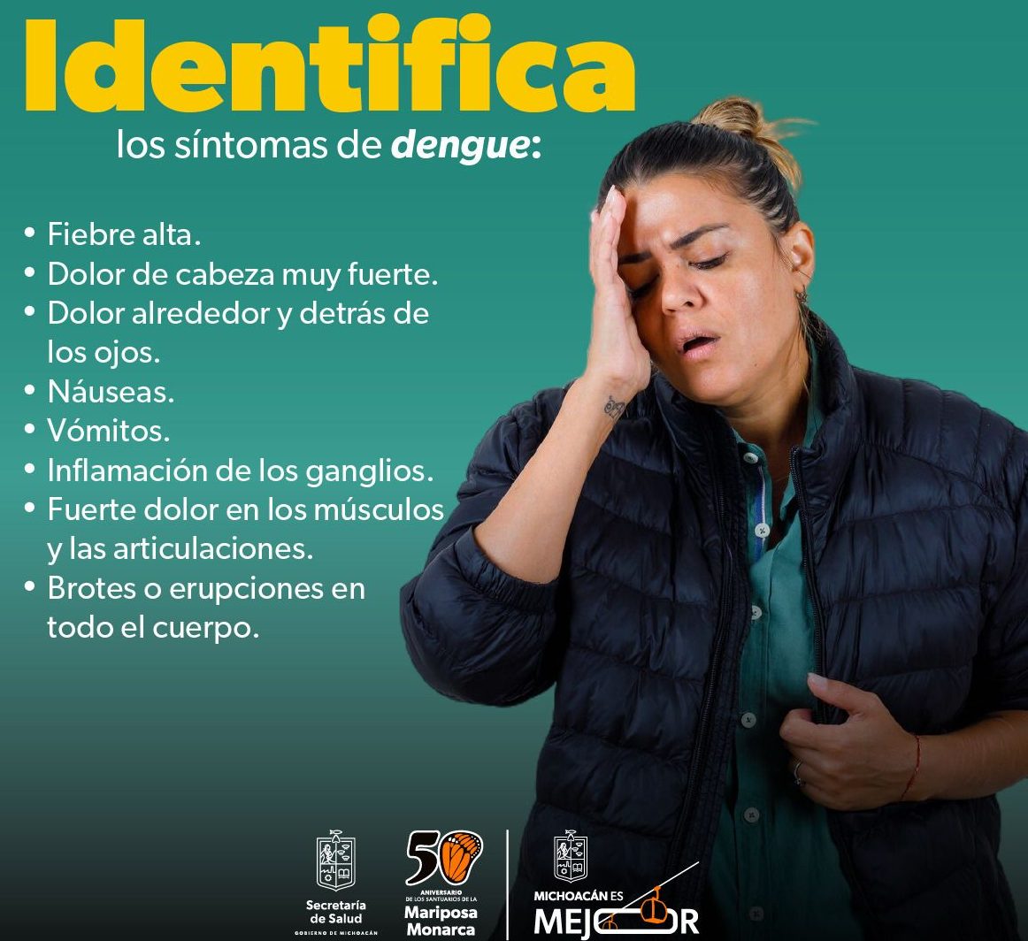 La Secretaría de Salud de Michoacán (SSM) te dice cómo detectar de manera oportuna signos y síntomas de alarma de un cuadro clínico de dengue grave, a efecto de que acudas de manera inmediata a un hospital para recibir tratamiento.