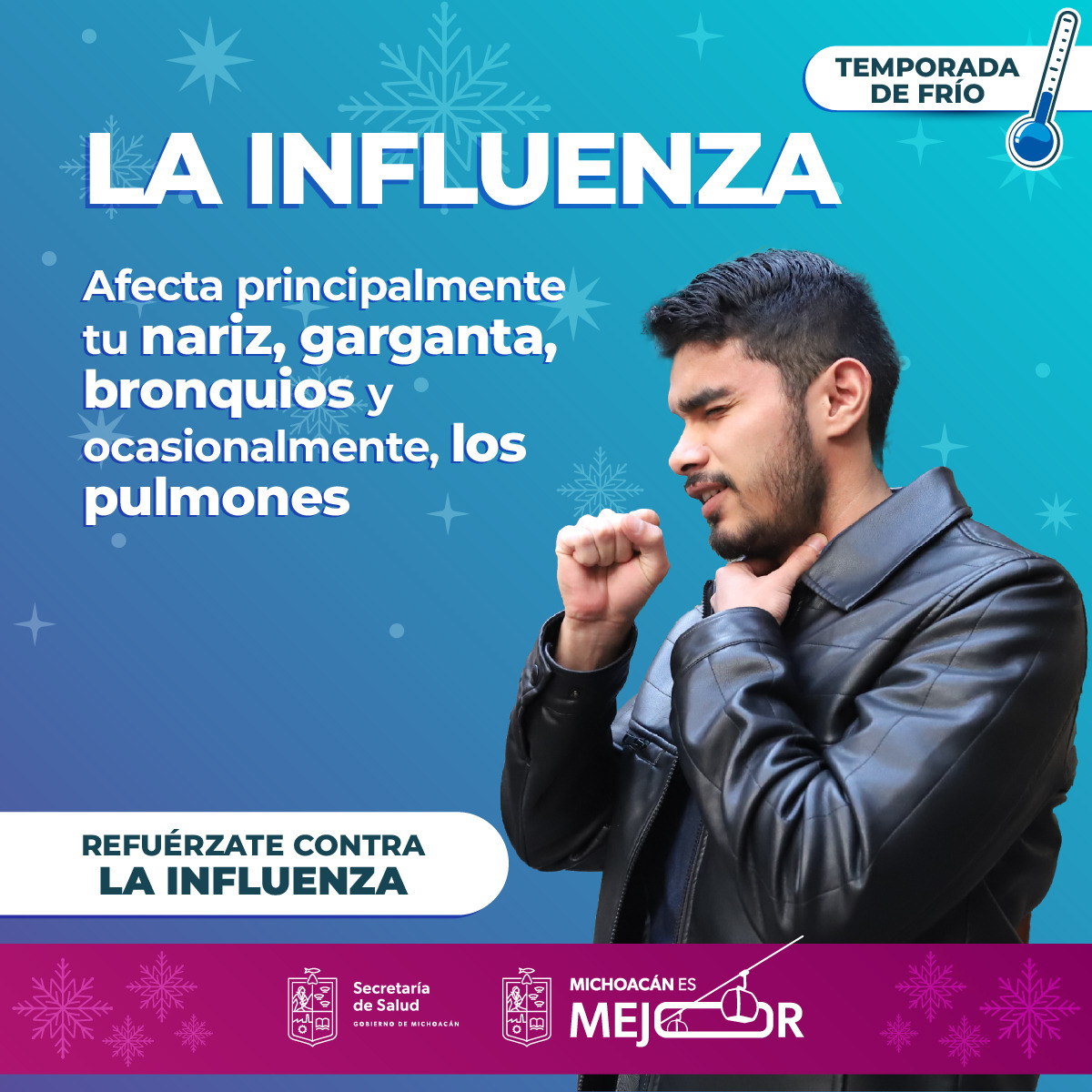 La influenza, también llamada gripe, es una infección de la nariz, la garganta y los pulmones, que son parte del sistema respiratorio y esta se transmite de persona a persona (el virus entra al organismo por la boca, nariz y ojos), a través de gotitas de saliva que se expulsan al estornudar o toser; también al saludar de mano, beso o abrazo a una persona enferma de una infección respiratoria.