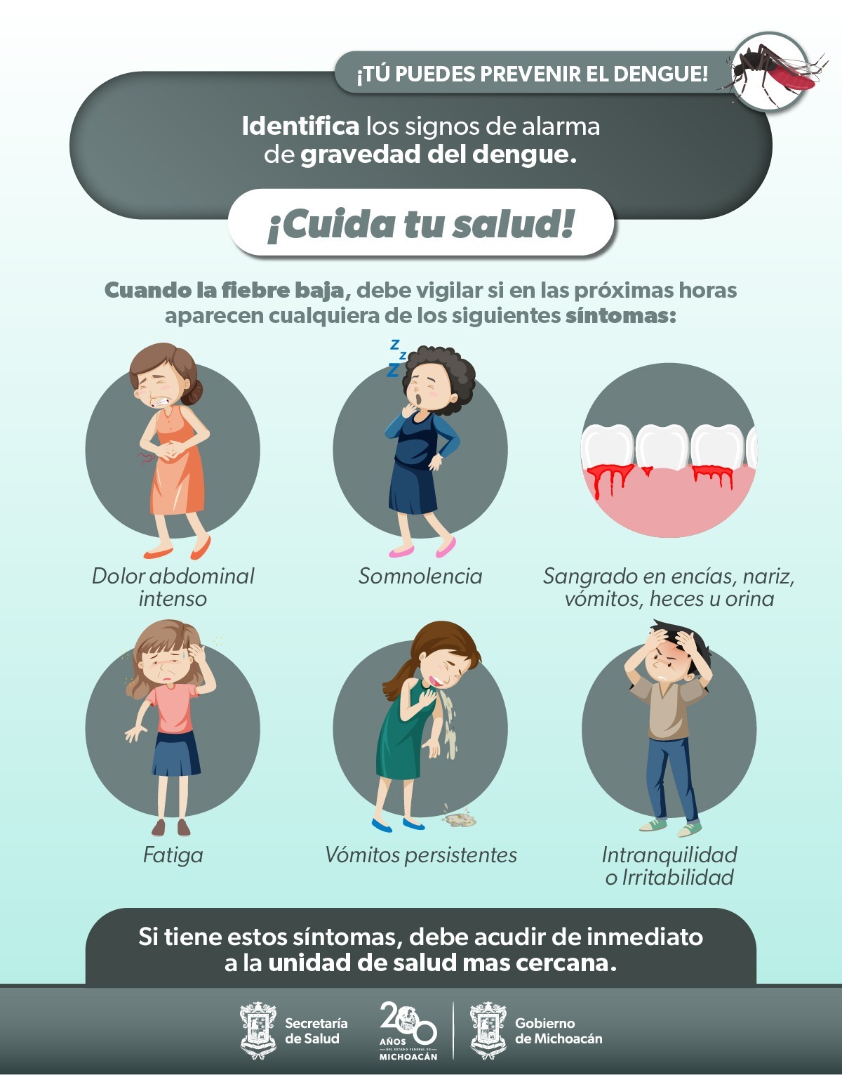 Estos signos suelen manifestarse entre los cuatro y 10 días posteriores a la picadura del insecto transmisor, que también puede ocasionar cansancio, hemorragias en nariz y encías, dolor abdominal y palidez en la piel, advirtió Juan Alejandro Rodríguez Hernández, jefe del departamento de Vectores y Zoonosis de la Secretaría de Salud de Michoacán (SSM).