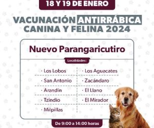 El objetivo es continuar libre de rabia en humanos en el estado, es por ello que del 18 al 19 de enero, se recorrerá casa por casa, en las localidades de Los Lobos, San Antonio, Arandín, Tzindio, Milpillas, Los Aguacates, Zacándaro, El Llano y El Mirador, con horario 9 a 14 horas.