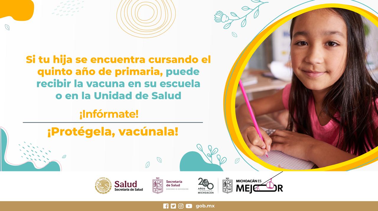 La Secretaría de Salud de Michoacán (SSM) reitera el llamado para vacunarse contra el Virus del Papiloma Humano (VPH) en los 364 centros de salud, pues la campaña permanecerá vigente hasta el 18 de diciembre, con la meta de aplicar 15 mil 596 dosis.