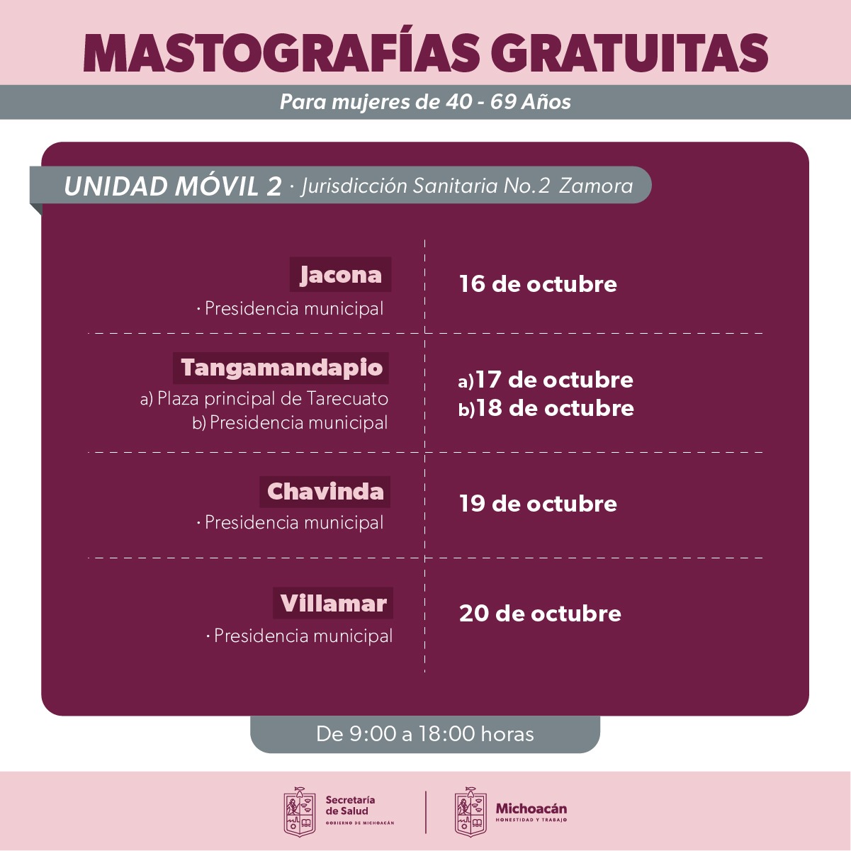 El 16 y 17 de octubre habrá estudios gratuitos en la explanada de la planta Good Foods de Tacámbaro, en Nuevo Parangaricutiro el 18 en la plaza principal de San Juan Nuevo y Uruapan tendrá una feria de la salud con servicio de mastografía el jueves 19 en la plaza principal y el viernes 20 atenderá en la plaza de la comunidad indígena de Angahuan.