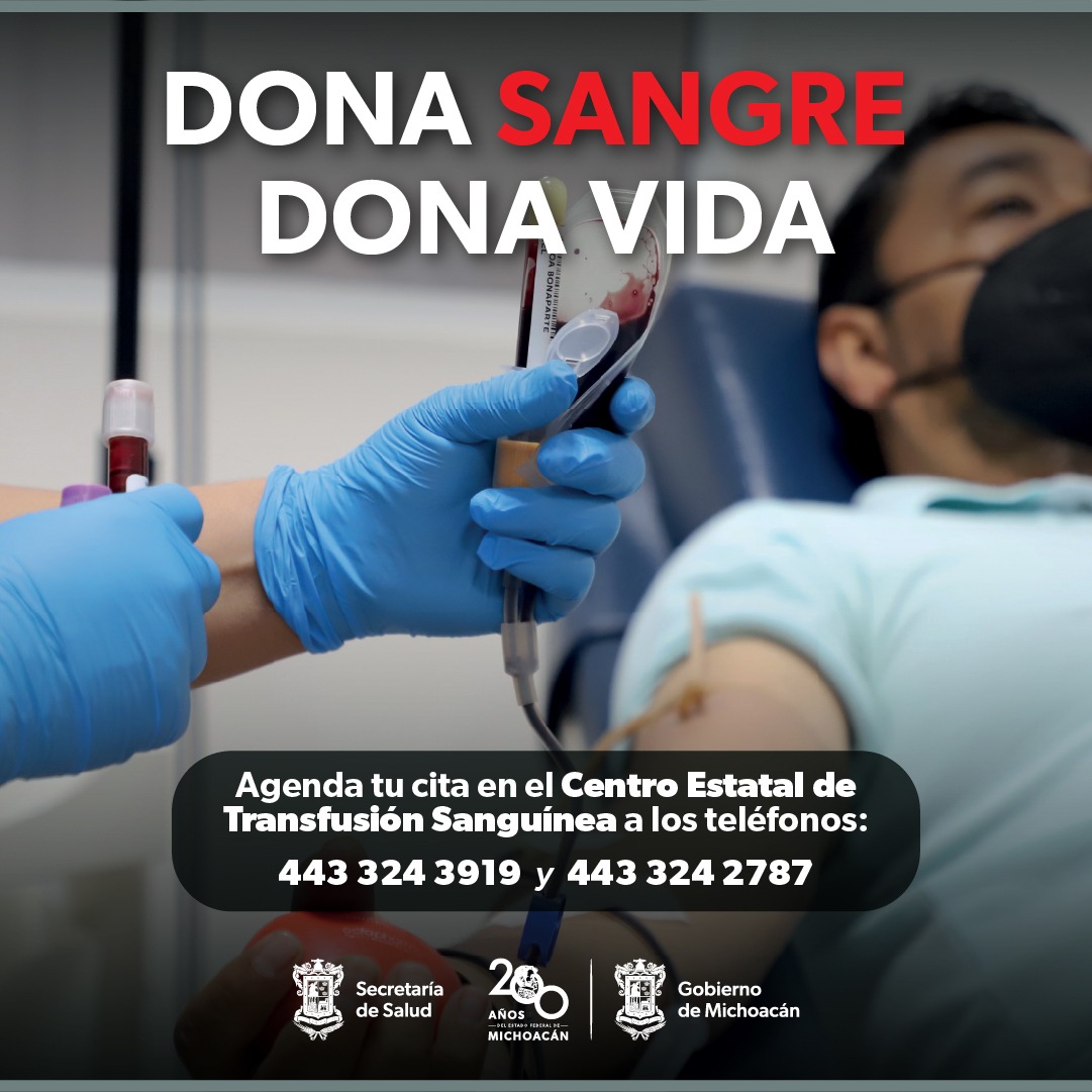 Morelia, Michoacán.- Una transfusión sanguínea puede salvar la vida de un paciente grave por cáncer, hemorragia obstétrica o accidente vial, es por ello la Secretaría de Salud de Michoacán (SSM) invita a la población a donar sangre de manera altruista.