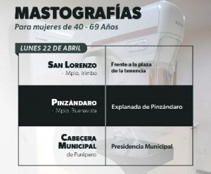 El lunes 22 de abril las unidades móviles de mastografía estarán en afuera de la presidencia municipal de Purépero; la explanada de Pizándaro, municipio de Buenavista; y frente a la plaza principal de la tenencia de San Lorenzo, de Irimbo.